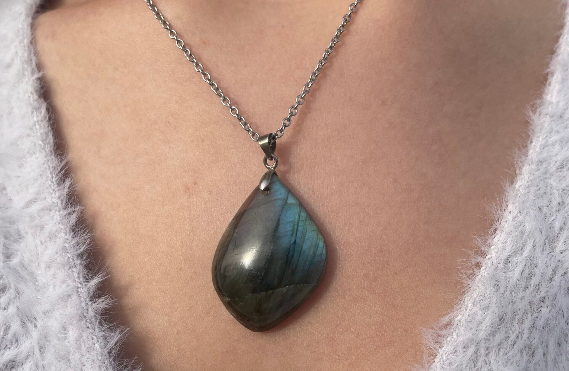 Collier en labradorite naturelle en forme de goutte, aux reflets bleus et verts. Une pierre protectrice et apaisante pour un style élégant et spirituel.